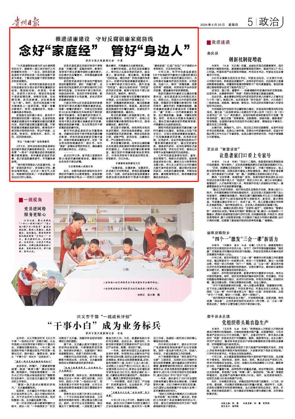 家庭是社会的最小单元,是党员干部拒腐防变的第一道防线。全省各地把清廉家庭建设作为清廉贵州建设的重要内容,把家风建设摆在重要位置,不断探索建设清廉家庭新路径,教育党员干部发挥示范带动作用,带头严家教、立家规、树家风,助推党风、政风、社风、民风持续向好。