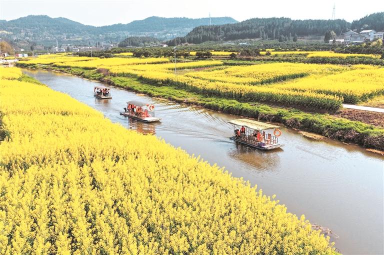 2026年3月5日,游客在四川省南充市蓬安县正源镇石牛村乘坐游船赏花游玩。 新华社发