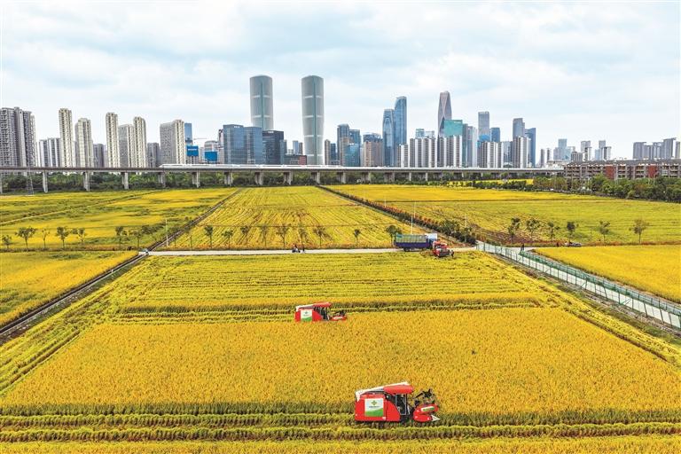 2025年10月21日,在浙江杭州萧山区,收割机在稻田里收割水稻,远处高铁列车飞驰而过。 新华社记者 徐昱 摄
