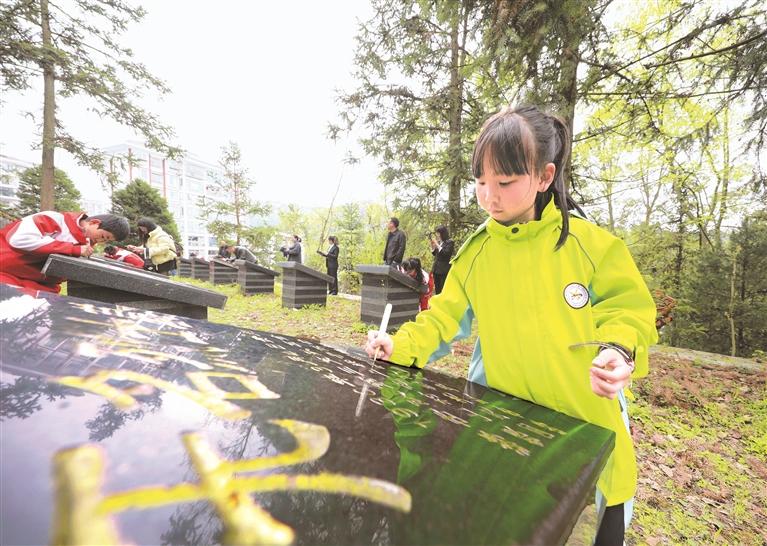 4月2日,毕节市在烈士陵园组织开展清明祭英烈活动,图为孩子们在为无名烈士墓擦拭除尘后认真描金,向革命先烈表达敬意。 黄忠贵 摄(影像贵州)