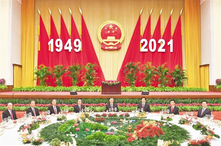 人民大会堂宴会厅华灯璀璨,洋溢着喜庆热烈的节日气氛。主席台上方国徽高悬,“1949-2021”的大字年号在鲜艳的红旗映衬下格外醒目。