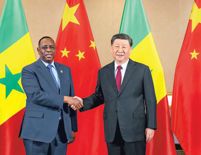 当地时间8月23日下午,国家主席习近平在约翰内斯堡出席金砖国家领导人会晤期间会见塞内加尔总统萨勒。