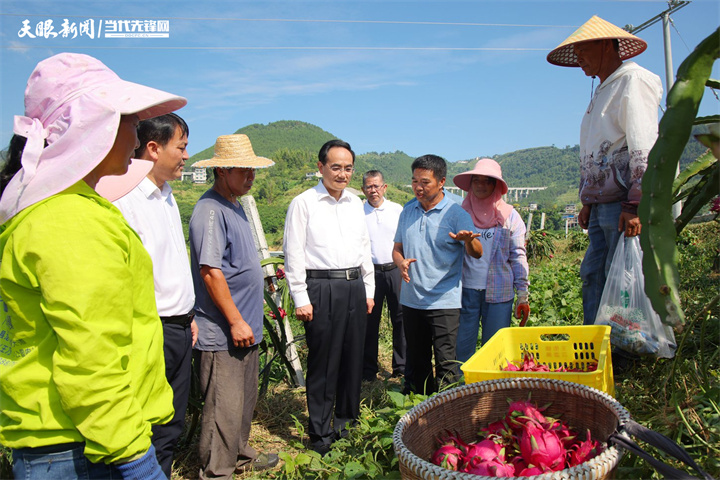 图为徐麟在沫阳镇沫阳村火龙果种植基地,深入田间地头察看火龙果收成,与务工群众交流。