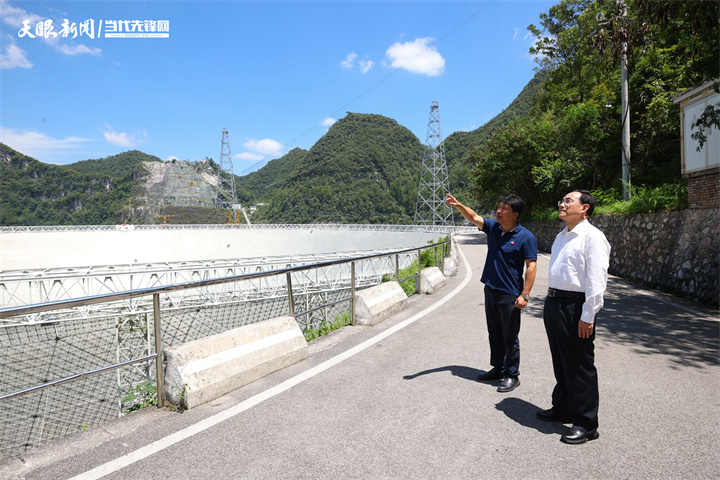 图为徐麟在500米口径球面射电望远镜(FAST),详细了解FAST建设运行和环境整治等情况。