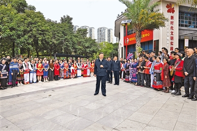 离开社区时,各族群众热情欢送总书记。习近平亲切地对大家说,我昨天结束对越南的国事访问,直接来广西考察调研。构建具有战略意义的中越命运共同体,将更有利于广西的开放发展,壮美广西前景光明。广西作为我国少数民族人口最多的自治区,各族人民同顶一片天、同耕一垌田、同饮一江水、同建一家园。全面建设社会主义现代化国家,一个民族都不能少。希望社区各族群众多来往,大家互帮互助,交知心朋友,做和睦邻居,共同建设幸福家园。