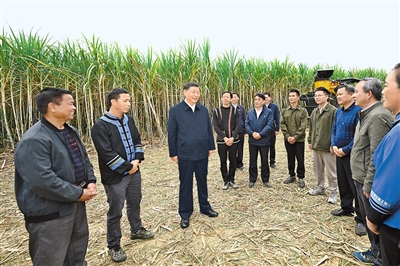 14日下午,习近平到来宾市考察调研。在国家现代农业产业园黄安优质“双高”糖料蔗基地,习近平察看万亩甘蔗林和机械化作业收割场景,听取基地情况介绍。他走进甘蔗林,详细了解甘蔗良种繁育技术要领,同蔗农、农机手和农技人员亲切交流。习近平指出,广西是我国蔗糖主产区,要把这一特色优势产业做强做大,为保障国家糖业安全、促进蔗农增收致富发挥更大作用。要积极培育和推广良种、提高机械化作业水平,建设好现代农业产业园。要探索建立更加稳定的利益联结机制,让广大农民共享农村改革和发展成果。他祝愿乡亲们的生活像甘蔗一样甜蜜。