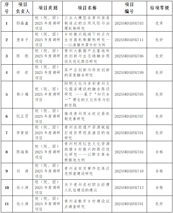 校(院、团)2025年度调研项目已完成结项评审。经专家评审、校委研究审议,确定11个项目通过验收,现将结项情况公布如下: