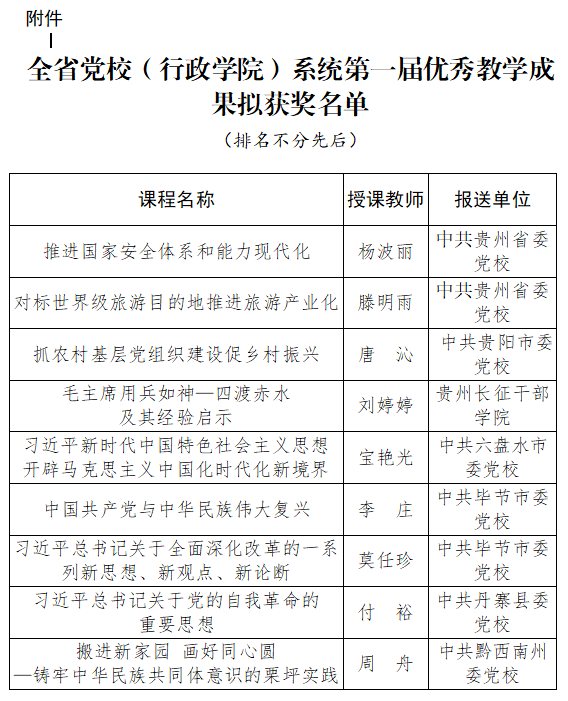 根据《关于推荐全省党校(行政学院、讲师团)系统第七届精品课候选课程的通知》(黔党校通〔2025〕35号),经各市(州)委党校(行政学院)推荐,中共贵州省委党校(贵州行政学院)组织多轮专家评审并提出拟获奖名单,报中共贵州省委党校(贵州行政学院)校(院)委会审议批准,现予以公示。