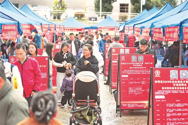 二月二十七日,贵阳市南明区二○二六年就业援助月暨“春风行动”专场招聘会在花果园海豚广场举办。此次招聘会共吸引五十余家企业参与,涵盖教育、文化传媒、电子商务、物流、家政及医药等多个领域,提供就业岗位二百余个。 赵松 摄 (影像贵州)
