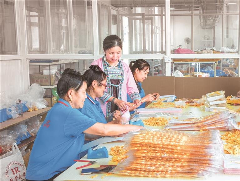 黔东南州从江县洛香镇井当社区,贵龙饰品加工厂的工人们正在赶制发往国外的新一批饰品订单。杨除英在生产线上耐心指导工人操作。